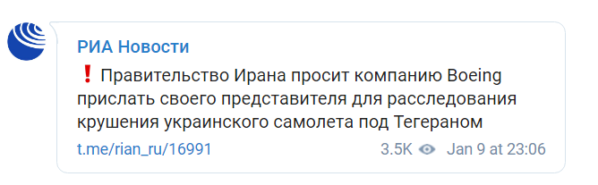 Как сообщала "Страна", американские СМИ сейчас обсуждают версию о том, что самолет компании "Международные украинские авиалинии" был сбит иранской зенитной ракетой. А исследовательская компания IHS Markit пришла к выводу, что украинский лайнер сбил "Корпус стражей Исламской революции", выпустив ракету "земля-воздух" с помощью произведенного в России зенитно-ракетного комплекса "Тор" (SA-15).