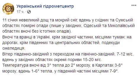 "11 января будет небольшой дождь и мокрый снег, а днем в восточных и Сумской областях умеренные осадки (только в западных, Одесской и Николаевской областях ночью без существенных осадков). Ночью и утром в Украине, кроме западной части, местами туман; на дорогах, кроме южных и центральных областей местами гололедица", - говорится в сообщении.