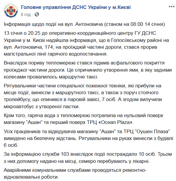 Главное управление ГСЧС в Киеве cо ссылкой на данные службы "103" сообщило о десяти пострадавших в происшествии у ТРЦ "Ocean Plaza", где под асфальт едва не ушел автобус с людьми, а сам торговый центр залило кипятком.