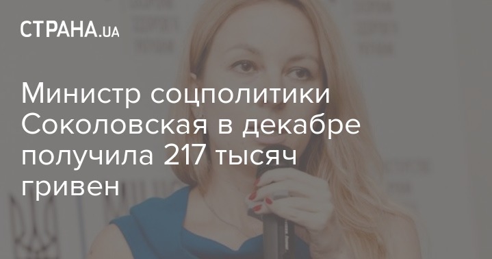 Министр социальной политики Юлия Соколовская в декабре получила 217 тыс. гривен, тогда как за ноябрь - 56,6 тыс. гривен. Ее заместители получили - от 65,4 тыс. до 168 тыс. гривен, а государственный секретарь министерства – 60,3 тыс. гривен. Об этом говорится в официальном ответе Минсоцполитики на запрос издания "Украинские новости".