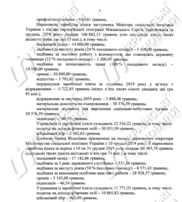 Зарплата заместителя министра Наталии Ненюченко составила 131 487 гривен (в частности, премия – 30 800 гривен и помощь на решение социально-бытовых проблем – 63 726 гривен), замов Олега Коваля – 168 144 гривны (премия – 27 867 гривен, помощь на оздоровление – 53 181 гривна и помощь на решение социально-бытовых проблем – 53 181 гривна), Виталия Музыченко – 65 441 гривна (30 800 гривен – премия), зарплата замминистра соцполитики по евроинтеграции Сергея Нижинского составила 166 842 гривны (премия – 30 800 гривен и помощь на оздоровление 50 376 гривен и на решение социально-бытовых проблем – 50 376 гривен) и госсекретаря Елены Богачовой с 10 по 31 декабря – 60 366 гривен.