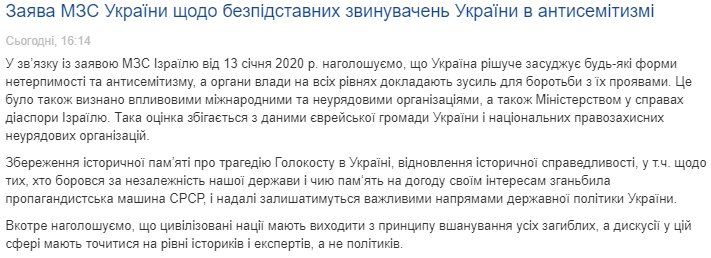 Так, в заявлении МИД Израиля говорится, что "лица, ответственные за убийство евреев во время Холокоста и в погромах, а также антисемитские идеологи Украинского национального движения в последнее время стали предметом публичного чествования в Украине.