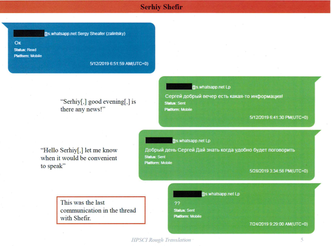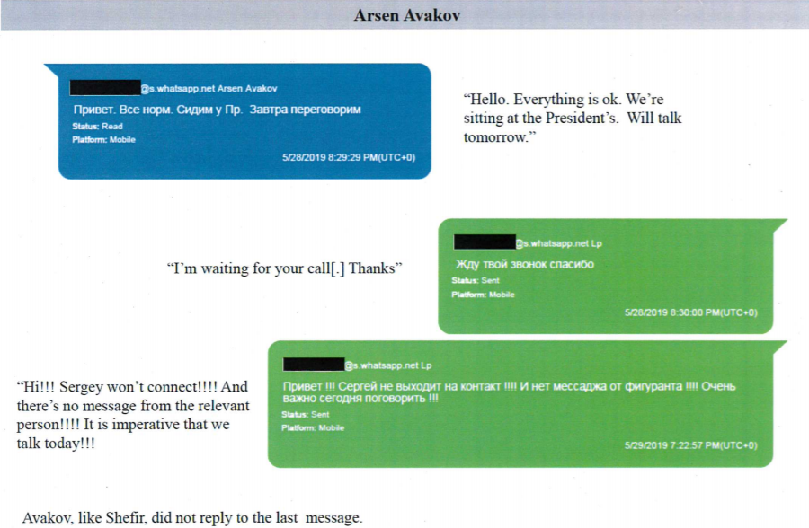 Уже в конце мая Аваков обещает Парнасу поговорить с Шефиром - видимо, на предмет контакта Джулиани и Зеленского. Однако тот жалуется, что "Сергей не выходит на контакт". Однако шеф МВД не отвечает (как и ранее "пропал с радаров" Шефир).
