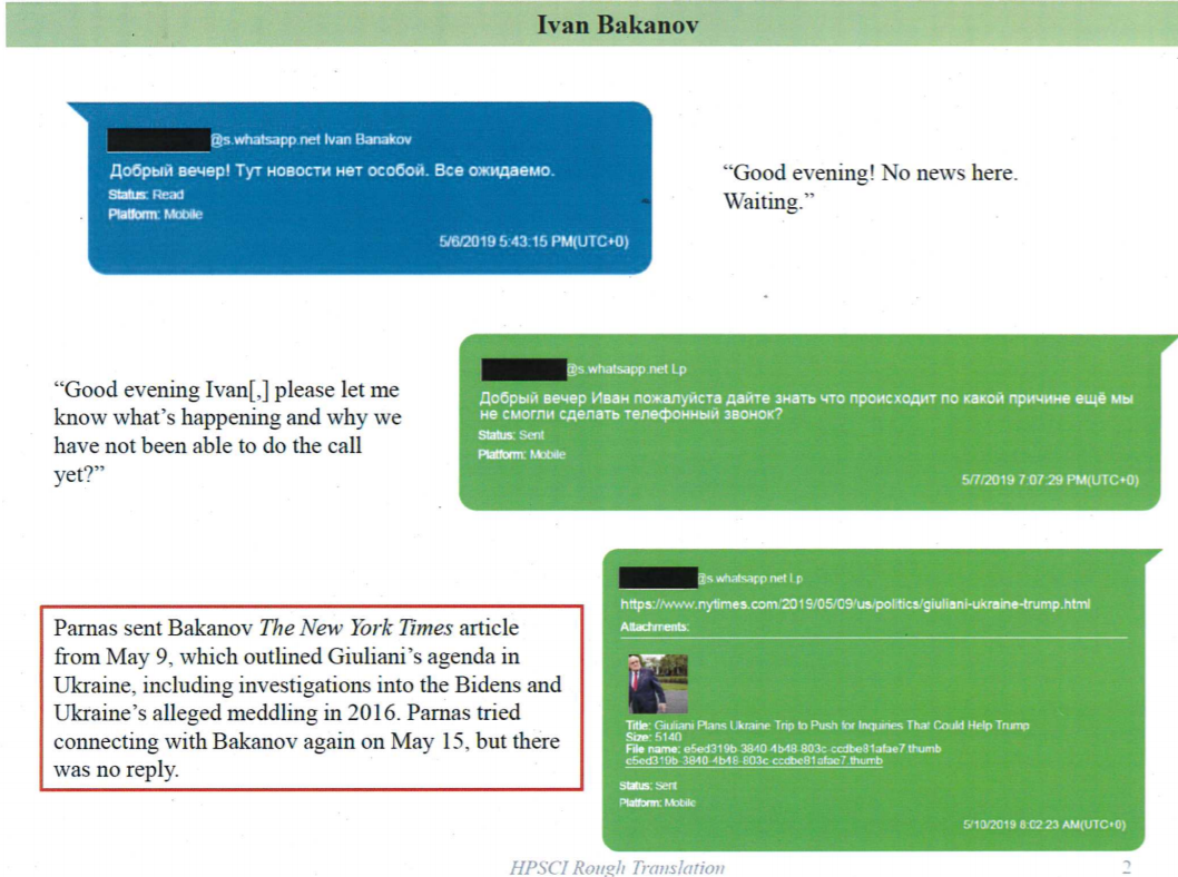 Через несколько дней Парнас снова "дергает" Баканова, но тот пишет, что новостей нет и нужно ждать. Бизнесмен отсылает соратнику Зеленского статью из New York Times с тезисами Джулиани относительно Украины (там говорится и о необходимости расследовать деятельность семьи Байденов).