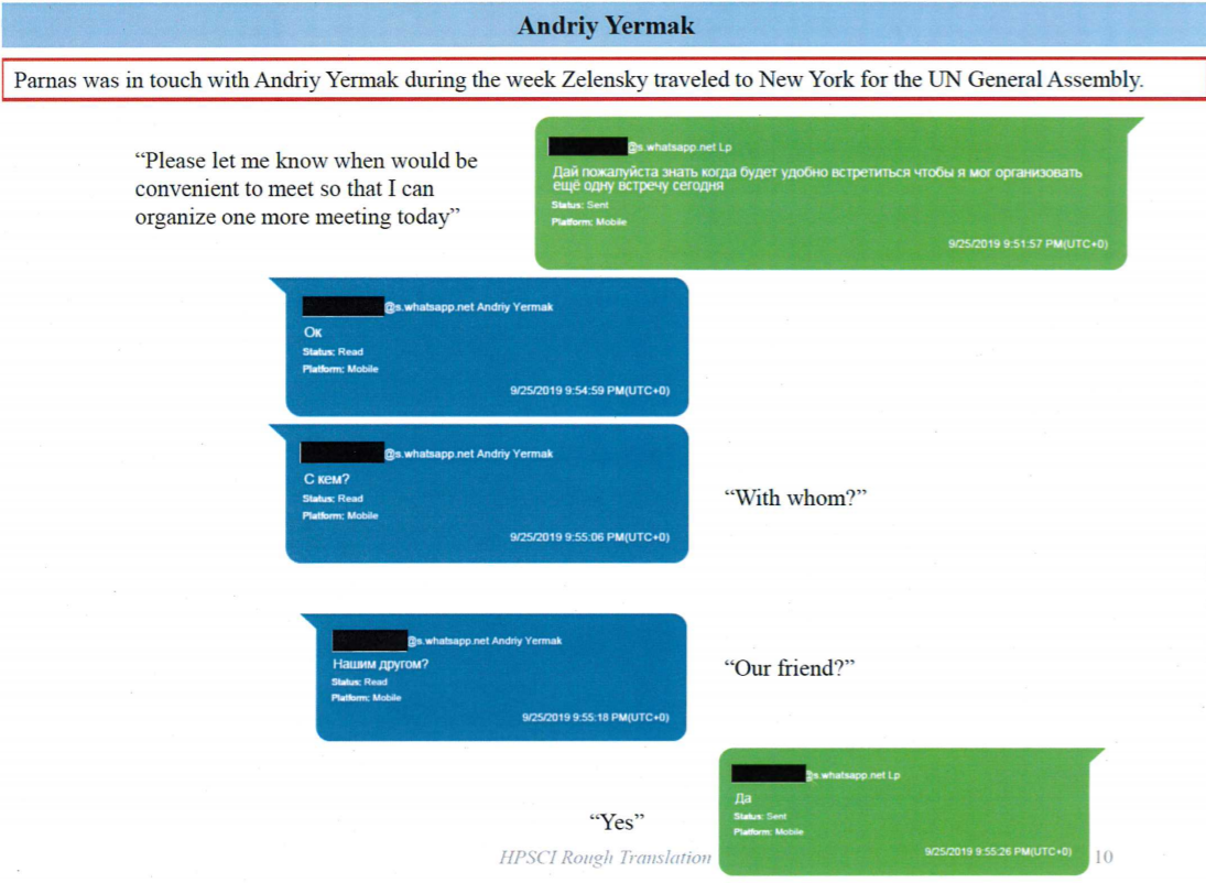 Чуть более продуктивным было общение Парнаса с помощником Зеленского Андреем Ермаком. Правда, это уже было гораздо позже - осенью, когда Зе летал на генассамблею ООН в Нью-Йорке. Видимо, там же был и Ермак.