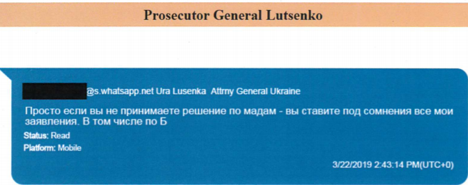 "Если вы не примете решение по мадам - вы ставите под сомнение все мои заявления. В том числе по Б (видимо, речь о Байдене - Ред.)", - предупреждает Луценко.