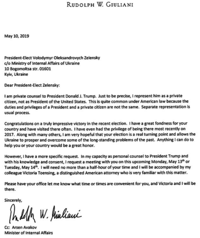 В письме Джулиани поздравляет Зе с победой на выборах и предлагает ему встретиться в Киеве 13 или 14 мая. "Я займу только полчача вашего времени", - обещает советник Трампа.