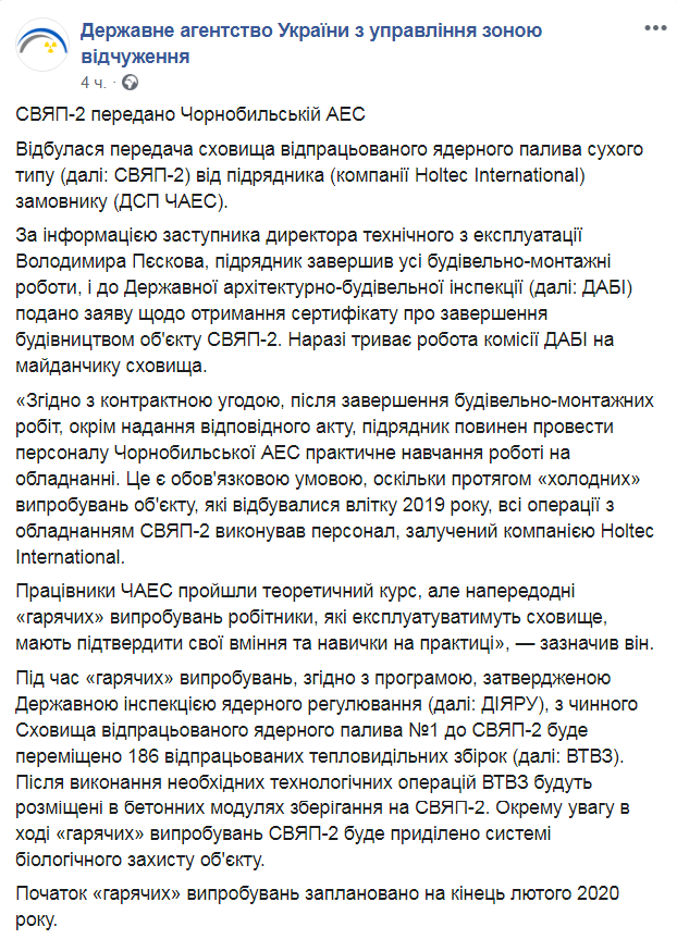 Американская компания Holtec International 15 января передала ЧАЭС хранилище отработанного ядерного топлива сухого типа (ХОЯТ-2). Об этом сообщает в Facebook Государственное агентство Украины по управлению зоной отчуждения.