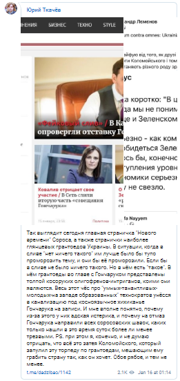 "Грантоеды во главе с Гончаруком (на видео - Ред.) представлены толпой косоруких олигофренов-интриганов, коими они являются. Весь этот чёс про "умных-танантливых-молодых-на западе образованных" технократов унёсся в канализацию под косноязычное хихиканье Гончарука на записи. И мне вполне понятно, почему из-за этого у них адская истерика, и почему на отмаз Гончарука направили всех соросовских шавок, каких только нашли в это время суток более ли менее трезвыми. PS. при этом я, конечно, и не думаю отрицать, что всё это затея Коломойского, который запулил эту торпеду по грантоедам, мешающим ему грабить страну так, как он хочет. Обое рябое, и тем не менее".