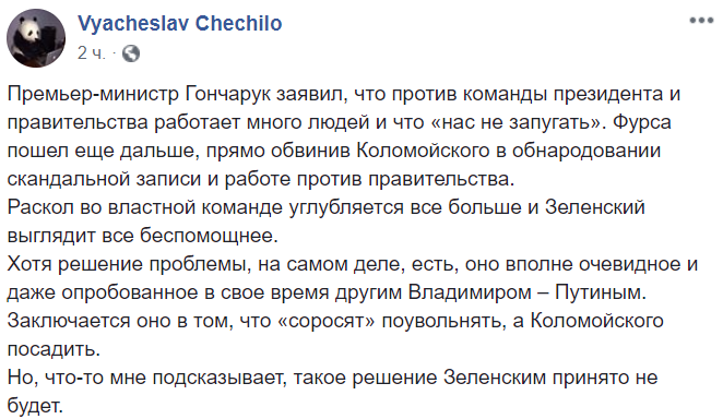 Кароч я за Гончарука. А говорящие жопы Коломойского могут сливать все что их душе угодно, но лить воду на их мельницу я не собираюсь. И вы не делайте".
