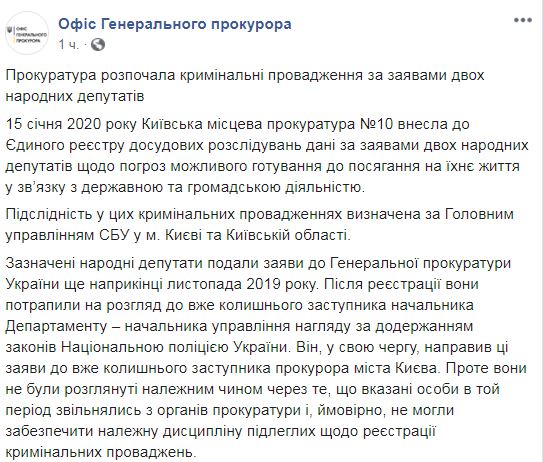 "Киевская местная прокуратура №10 внесла в Единый реестр досудебных расследований данные по заявлениям двух народных депутатов относительно угроз возможного приготовления к посягательству на их жизнь в связи с государственной и общественной деятельностью", - говорится в сообщении.