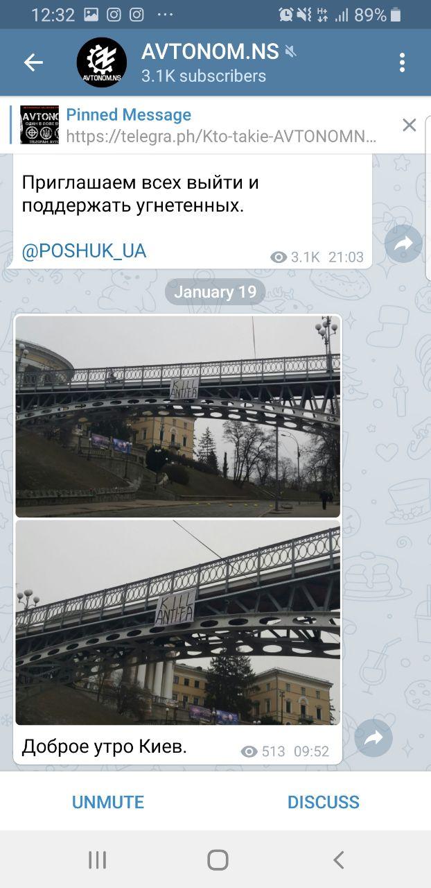 Накануне в телеграмм-канале националистов были опубликованы сообщения с призывом ликвидировать участников антифашистской акции. Утром на майдане независимости появился флаг с надписью "Убить антифашиста".