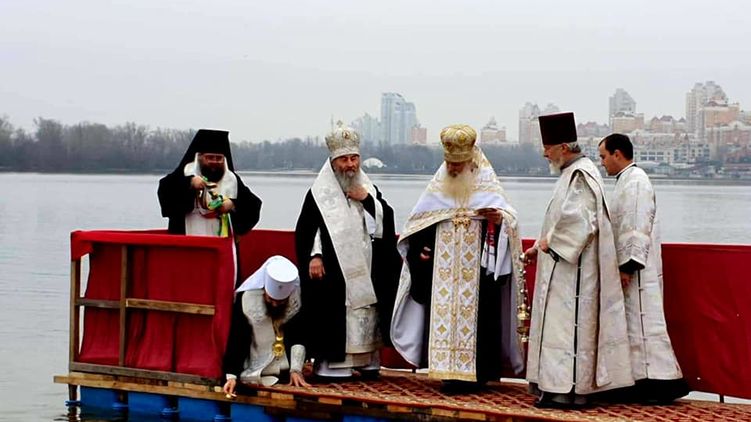 "Предстоятель УПЦ трижды погрузил крест в воды Днепра, совершая чин Великого освящения вод, после чего он выпил святую агиасму прямо из реки и умылся крещенской водой. Его примеру последовал митрополит Антоний и епископы УПЦ", - говорится в сообщении.