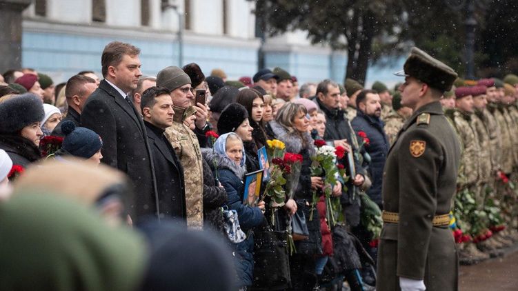 В понеедльник 20 января президент Украины Владимир Зеленский принял участие в мероприятиях у здания Министерства обороны в память о военнослужащих, погибших в боях за донецкий аэропорт.