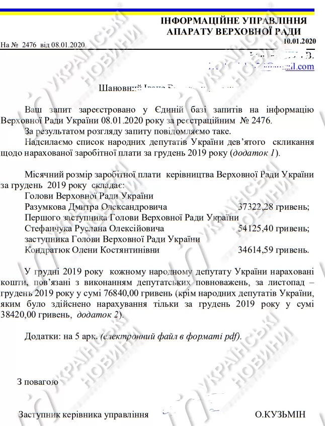 Также председатель и вице-спикеры украинского парламента получили по 76 тысяч 840 гривен на выполнение депутатских полномочий за период ноябрь-декабрь. Об этом стало известно из ответа аппарата Верховной Рады на запрос издания Українські Новини.