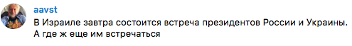 "В Израиле завтра состоится встреча президентов России и Украины. А где ж еще им встречаться", - написал журналист.
