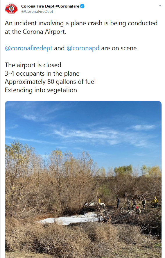 "В аэропорту Короны ведется расследование авиакатастрофы. В результате происшествия погибли четыре человека. Аэропорт закрыт. Около 80 галлонов топлива ушли в землю", - уточнила пресс-служба местных пожарных.