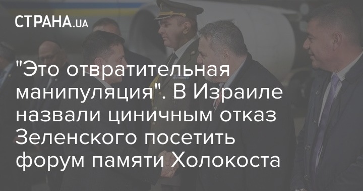 Представители мемориального комплекса "Яд Вашем" назвали поступок президента Украины Владимира Зеленского, который отказался от участия в Всемирном форуме памяти Холокоста, "отвратительной манипуляцией", а его поведение "циничным и сбивающим с толку". В свою очередь Зеленский объяснил свои действия тем, что на форуме не хватило мест для всех желающих и он передал свое тем, кто пережил трагедию.