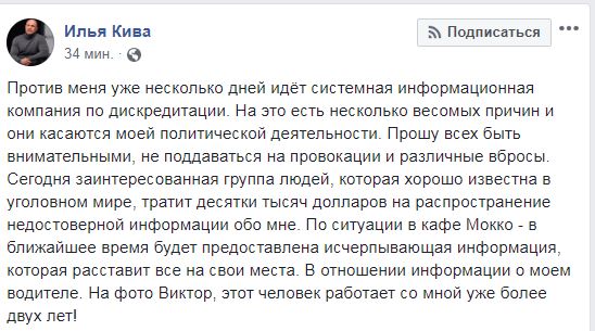 Чуть позднее Кива в Facebook выложил фото с водителем по имени Виктор, который работает с нардепом уже более двух лет. Кива заявил, что против него "идёт системная информационная компания по дискредитации".