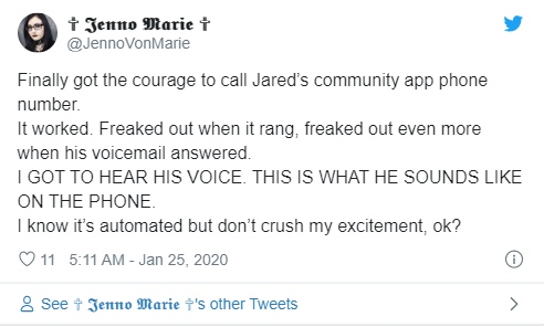 "Наконец-то набралась смелости позвонить на номер телефона Джареда. Это сработало. Я была в шоке, когда услышала гудки и его голосовая почта ответила. Я должна была услышать его голос. И он звучал по телефону. Но это была запись..." - пишет одна из ошеломленных поклонниц.