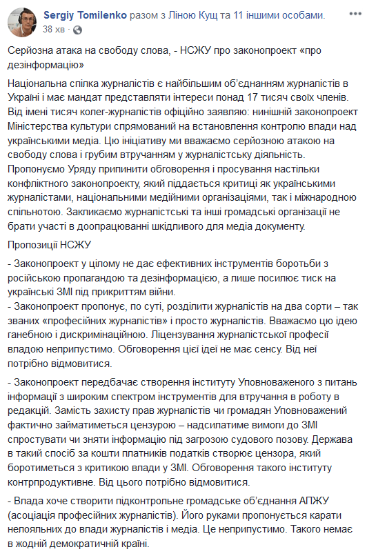 "Мы не будем с чиновниками "бороться за запятые", торговаться за меру уголовной ответственности. НСЖУ не вошел и не будет входить в рабочую группу Минкульта по разработке нынешнего законопроекта о дезинформации. Считаем невозможным обсуждать инструменты давления на медиа и формы ограничения свободы слова", - заявил Сергей Томиленко.