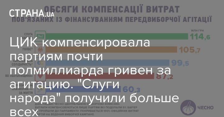 Центральная избирательная комиссия, согласно норме закона "О политических партиях в Украине" о возмещении расходов на агитацию, получила средства из бюджета и перечислила их партиям. Стоит отметить, что бюджет компенсирует 100% расходов партиям, которые прошли в парламент.