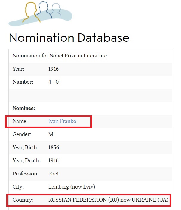 Иван Франко в 1916 году был номинантом на Нобелевскую премию, но так и не получил ее. На сайте Нобелевского комитета в разделе "Номинанты" есть запись об украинском писателе, в графе "страна" указано "Российская Федерация (сейчас Украина)".