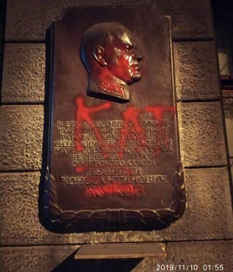 А мемориальную доску Георгию Жукову на стене дома, где он жил, разбили неизвестные.