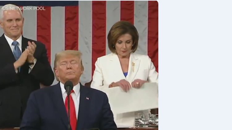 Во время выступления Трампа она вместе с вице-президентом Майком Пенсом сидела за его спиной. Когда президент США закончил спич, все встали и начали аплодировать, Пэлоси в этот момент пополам разорвала свою копию речи и отшвырнула клочки бумаги в сторону.
