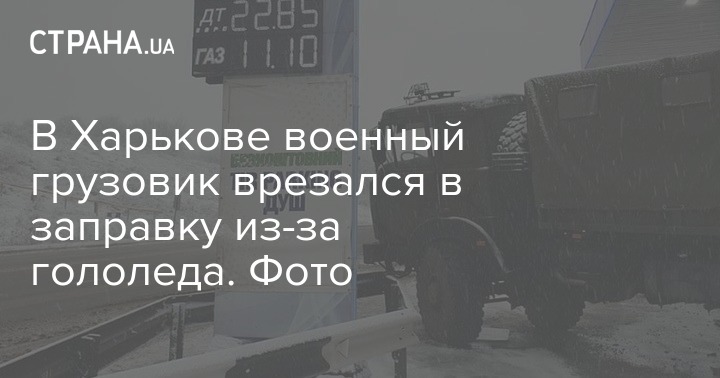В среду, 5 февраля, на Окружной дороге в Харькове, около 07:00 водитель военного грузовика МАЗ не смог справиться с управлением и врезался в колонну, которая поддерживает крышу автозаправки. Предположительно ДТП произошло из-за того, что транспорт заскользил на дороге, покрытой льдом.