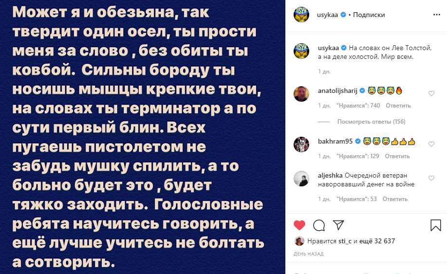 Пост набрал почти 33 тысячи "лайков", в том числе от известного российского боксера Бахрама Муртазалиева.