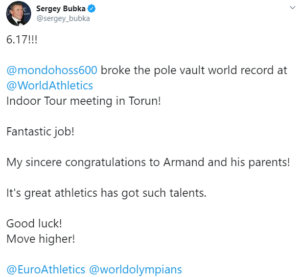 "6,17 !!! Арман Дюплантис побил мировой рекорд по прыжкам с шестом внутри помещения в Торуни Фантастическая работа! Мои искренние поздравления Арману и его родителям! Это здорово, что у легкой атлетики есть такие таланты. Удачи! Двигайся выше!", - написал Бубка в своем Twitter