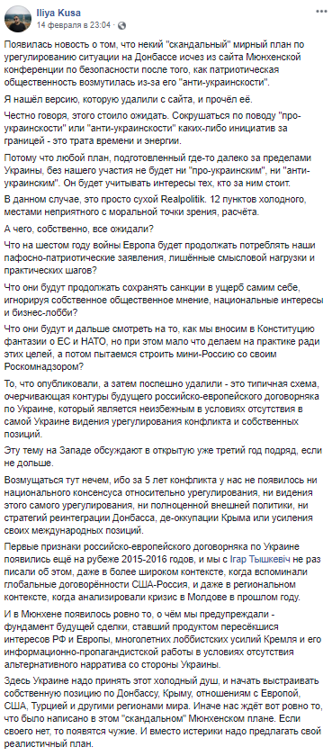 "То, что опубликовали, а затем поспешно удалили - это типичная схема, очерчивающая контуры будущего российско-европейского договорняка по Украине, который является неизбежным в условиях отсутствия в самой Украине видения урегулирования конфликта и собственных позиций. Эту тему на Западе обсуждают в открытую уже третий год подряд, если не дольше", - пишет в Facebook политолог-международник Илья Куса.