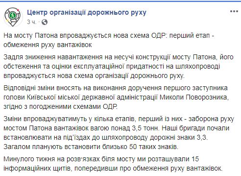 "Для снижения нагрузки на несущие конструкции моста Патона, его обследования и оценки эксплуатационной пригодности на путепроводе внедряется новая схема организации дорожного движения", - пишет предприятие.