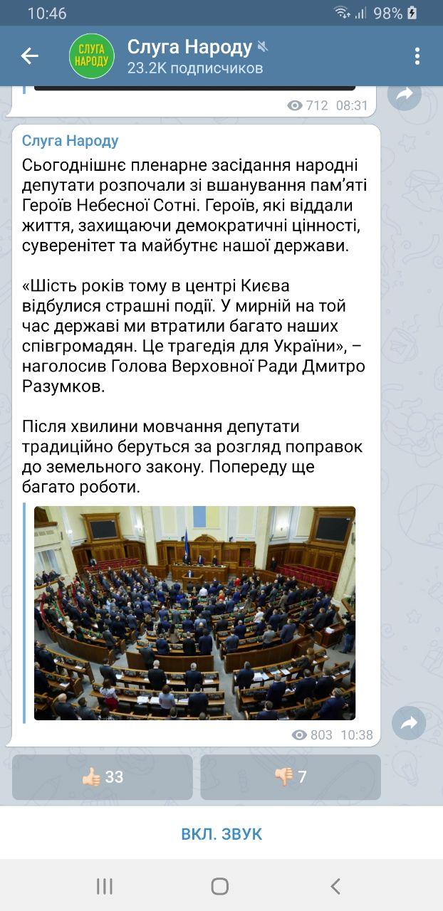 Утро началось с телеграм-сообщения партии "Слуга народа". В нем  вспомнили только про активистов Майдана.