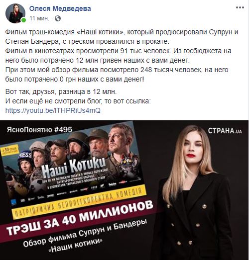 При этом обзор фильма на YouTube-канале "Страны", который провела в блоге "Ясно.Понятно" Олеся Медведева, посмотрело 248 тысяч человек. То есть, в 2,7 раза больше. "Фильм трэш-комедия "Наші котики", который продюсировали Супрун и Степан Бандера, с треском провалился в прокате. Фильм в кинотеатрах просмотрели 91 тыс человек. Из госбюджета на него было потрачено 12 млн гривен наших с вами денег. При этом мой обзор фильма посмотрело 248 тысяч человек, на него было потрачено 0 грн наших с вами денег!", - написала на своей странице в Facebook Олеся Медведева.