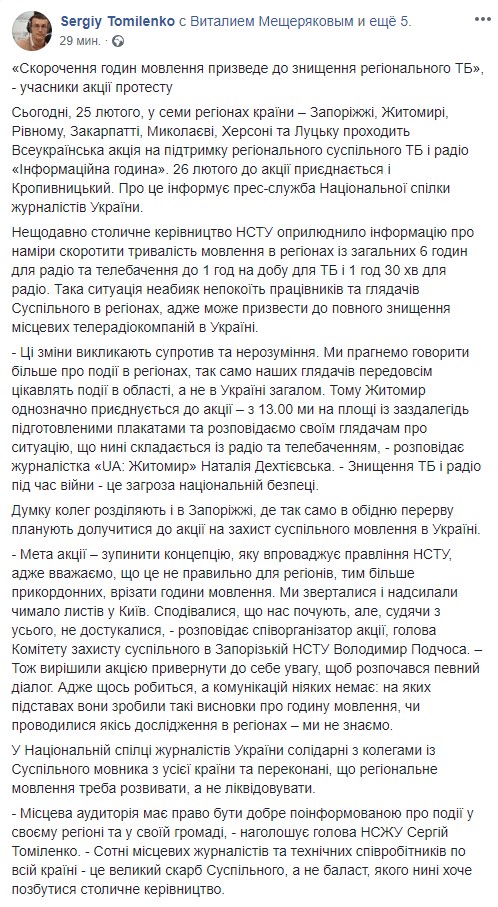 "Местная аудитория имеет право быть хорошо проинформированной о событиях в своем регионе и в своей общине", - отмечает председатель НСЖУ Сергей Томиленко. - "Сотни местных журналистов и технических сотрудников по всей стране - это большой клад Общественного, а не балласт, от которого нынче хочет избавиться столичное руководство".