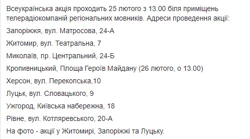 Как пишет Томиленко, Всеукраинская акция проходит 25 февраля с 13.00 возле помещений телерадиокомпаний региональных вещателей.