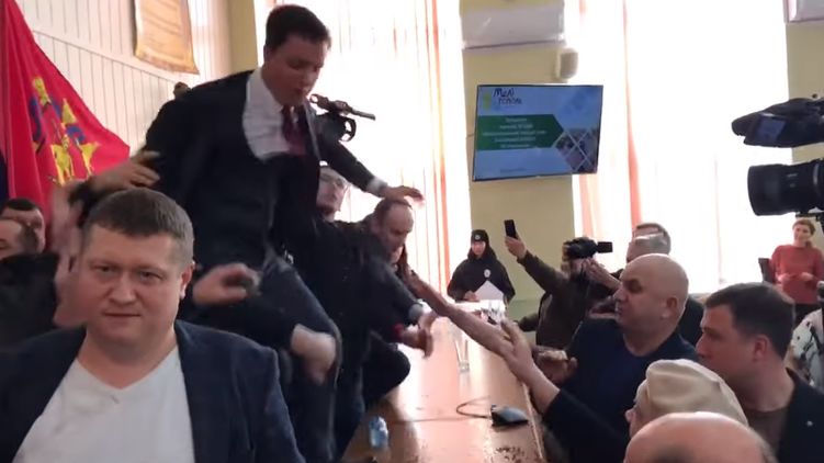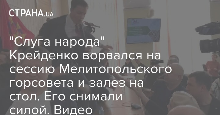 В четверг, 27 февраля, нардеп от "Слуги народа" Владимир Крейденко побывал на сессии Мелитопольского горсовета и попал там в скандал: он вместе с помощниками блокировал трибуну, его документы облили водой, а потом и вовсе силой сняли со стола, куда он залез, чтобы отстраниться от окруживших его местных депутатов.