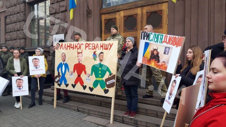 Он отмечает, что сегодня Порошенко пришло поддержать мало людей - обычно их гораздо больше. На ярких плакатах надписи о реванше со стороны новой власти, а также обвинения главы ГБР к причастности с нечистой силе в лице президента России Владимира Путина.