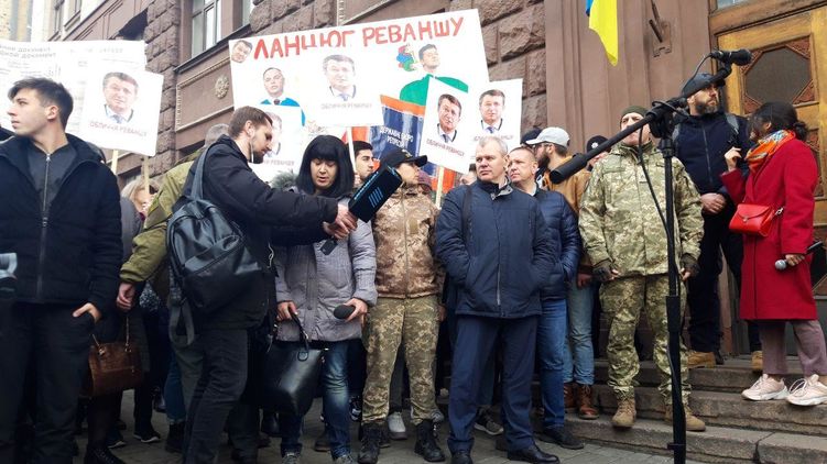 Во время их выступления кто-то из поддержки Порошенко вытолкнул из толпы журналиста Павловский News. Кроме того, после выступления защиты, митингующие начали кричать "Ганьба Шарию", после чего журналиста издания Шария вывели в сопровождении полиции. Сейчас толпа пока еще не расходится.