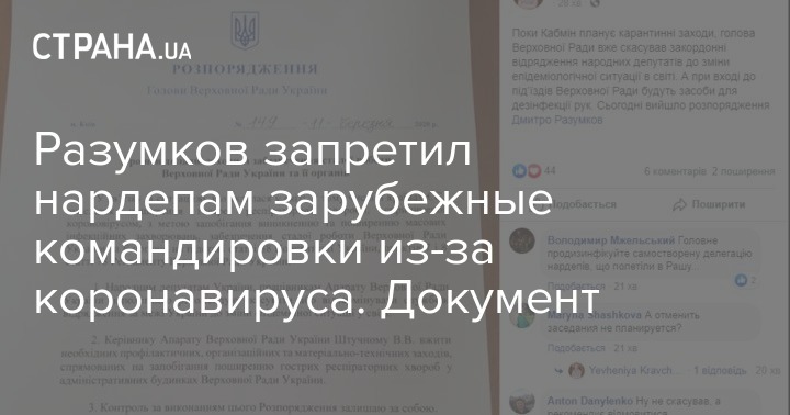"Пока Кабмин планирует карантинные мероприятия, глава Верховной Рады уже отменил зарубежные командировки народных депутатов до изменения эпидемиологической ситуации в мире. А при входе в подъезды Верховной рРады будут средства для дезинфекции рук. Сегодня вышло распоряжение Дмитрия Разумкова", - написала Евгения Кравчук.