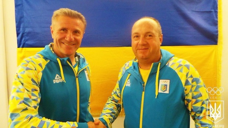 Сергей Бубка приветствует знаменосца Украины Николая Мильчева, НОК Украины