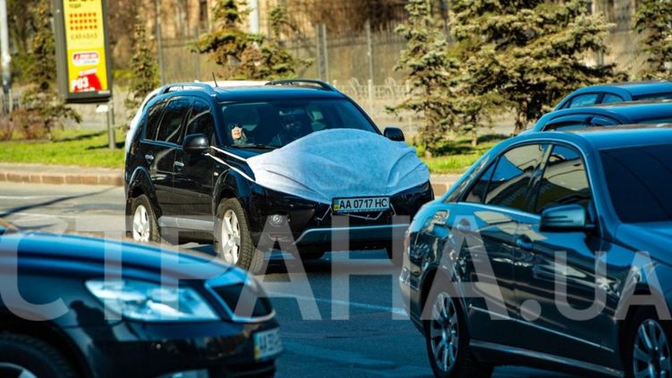 По Киеву ездит автомобиль, капот которого закрыт огромной защитной маской. Вероятно владелец кроссовера Mitsubishi надел респиратор на свою машину для того, чтобы лишний раз напомнить жителям столицы о введенном из-за коронавируса карантине.