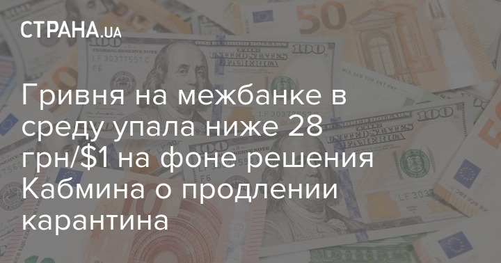 Гривня на межбанке в среду упала ниже 28 грн/$1 на фоне решения Кабмина о продлении карантина