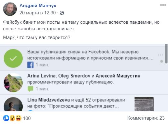 Журналист Андрей Манчук также заметил, что соцсеть стала блокировать посты на тему пандемии коронавируса. Но если пожаловаться на бан - то их восстанавливают.