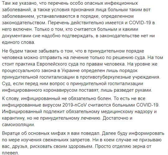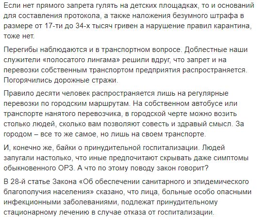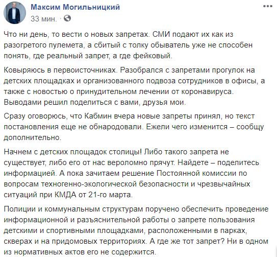 "А где же тот запрет? Ни в одном из нормативных актов его не содержится.... Либо такого запрета не существует, либо его от нас вероломно прячут. Если нет прямого запрета гулять на детских площадках, то и оснований для составления протокола, а также наложения безумного штрафа в размере от 17-ти до 34-х тысяч гривен а нарушение правил карантина, тоже нет", - констатировал Могильницкий.