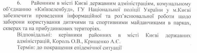 Он говорит, что документа о запрете пребывания на детских площадках нет. Есть решение Постоянной комиссии по вопросам техногенно-экологической безопасности и чрезвычайных ситуаций при КГГА от 21-го марта, в котором говорится, что полиции и коммунальным структурам поручено обеспечить проведение информационной и разъяснительной работы о запрете пользования детскими и спортивными площадками, расположенными в парках, скверах и на придомовых территориях.