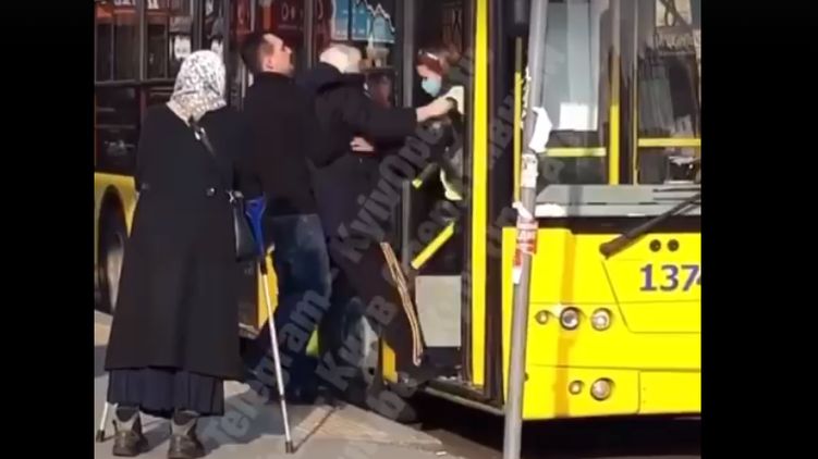 На опубликованных на странице "Киево оперативный" в соцсети кадрах видно, как выброшенный на улицу старик от бессилия начал колотить кулаками в закрытую дверь троллейбуса. Также на остановке рядом с ним стоит пожилая женщина на костылях. Не исключено, что она тоже надеется, что ей удастся воспользоваться транспортом.
