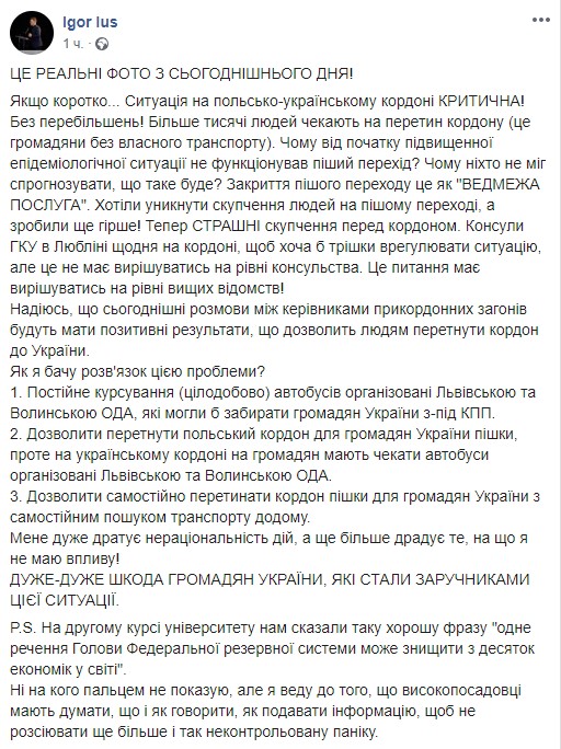 "Если коротко... Ситуация на польско-украинской границе критическая! Без преувеличений! Более тысячи людей ждут пересечения границы (это граждане без собственного транспорта). Почему с начала повышенной эпидемиологической ситуации не функционировал пеший переход? Почему никто не мог спрогнозировать, что такое будет? Закрытие пешего перехода это как "Медвежья услуга". Хотели избежать скопления людей на пешем переходе, а сделали еще хуже! Теперь страшные скопления перед границей. Консулы ГКУ в Люблине ежедневно на границе, чтобы хотя бы немного урегулировать ситуацию, но это не должно решаться на уровне консульства. Этот вопрос должен решаться на уровне высших ведомств!", - написал он.